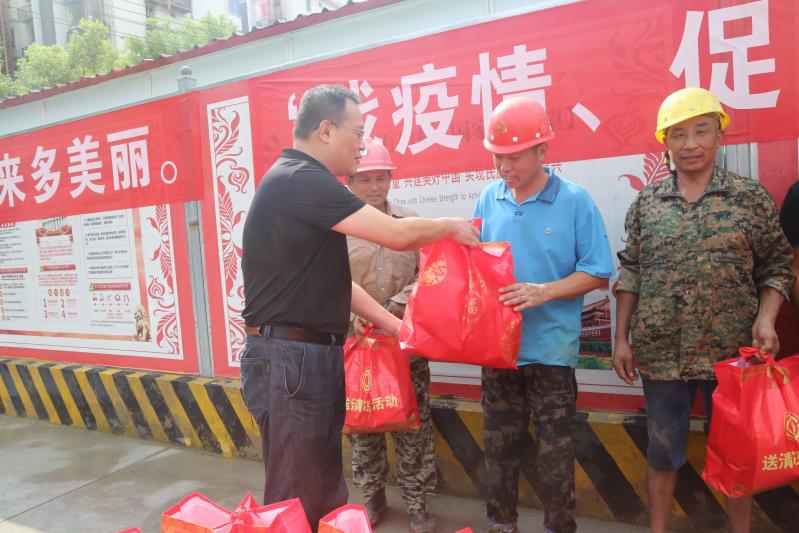 入夏以來(lái),南昌旅游集團積極開(kāi)展“戰疫情、促文明、保安康”送清涼活動(dòng),7月28日上午,南旅集團黨委書(shū)記、董事長(cháng)、總經(jīng)理李明,黨委副書(shū)記李虹虹,黨委委員、副總經(jīng)理陳皓等領(lǐng)導,冒著(zhù)高溫,來(lái)到我市重點(diǎn)工程“繩金塔民俗風(fēng)情街”項目,送上綠豆、蓮子等愛(ài)心禮包,向戰斗在一線(xiàn)建設的干部職工表示慰問(wèn)。李明在聽(tīng)完工程建設情況匯報后,仔細詢(xún)問(wèn)了現場(chǎng)工人工作、生活狀況,叮囑項目部要一手抓好工程建設,一手抓好防疫防暑,切實(shí)關(guān)心工人身心健康,確保職工安全生產(chǎn),文明施工,為我市創(chuàng )建健康、文明城市作貢獻。公司黨委書(shū)記、總經(jīng)理龔戩等班子成員全程陪同。
