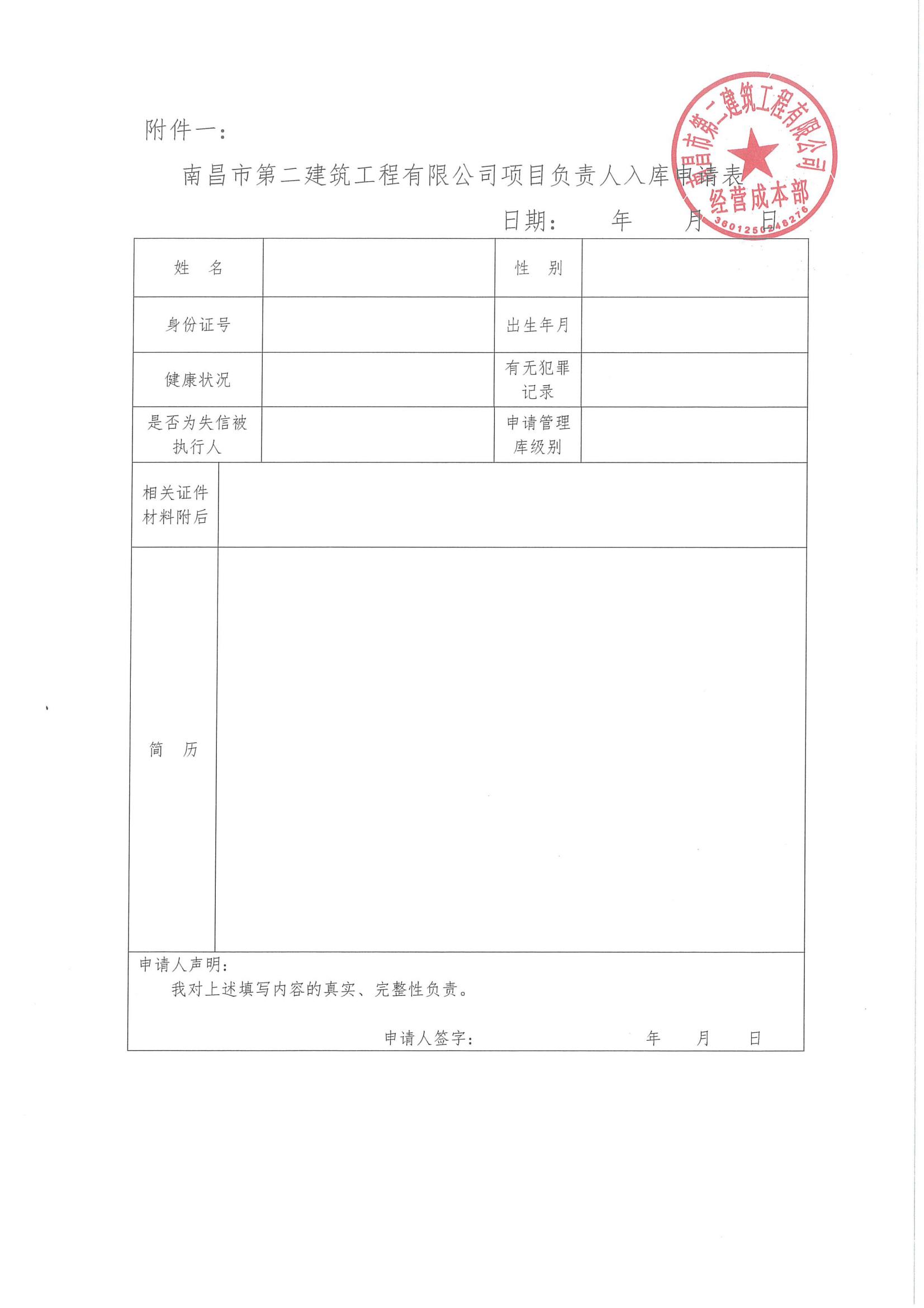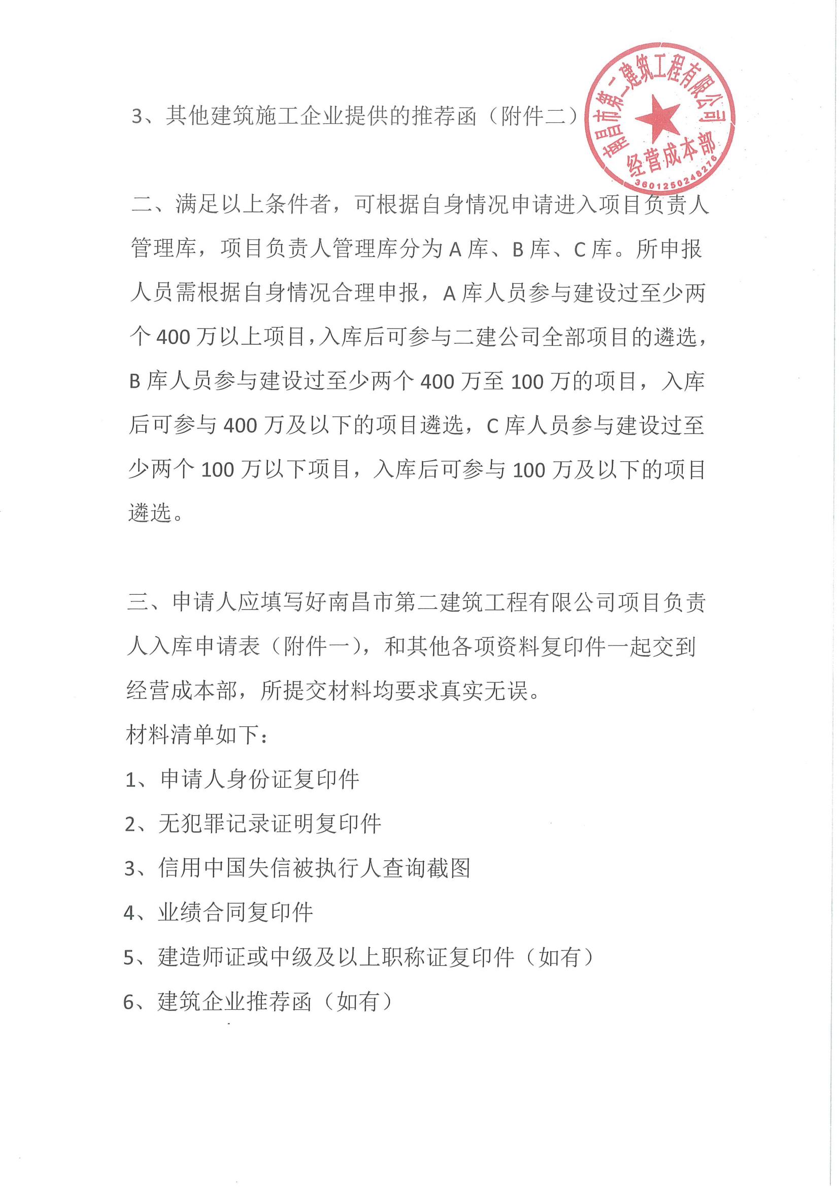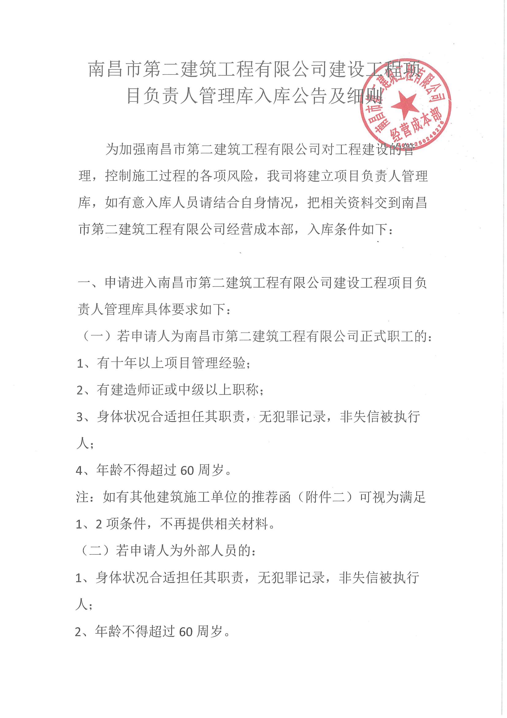 南昌市第二建筑工程有限公司建設工程項目負責人管理庫入庫公告及細則